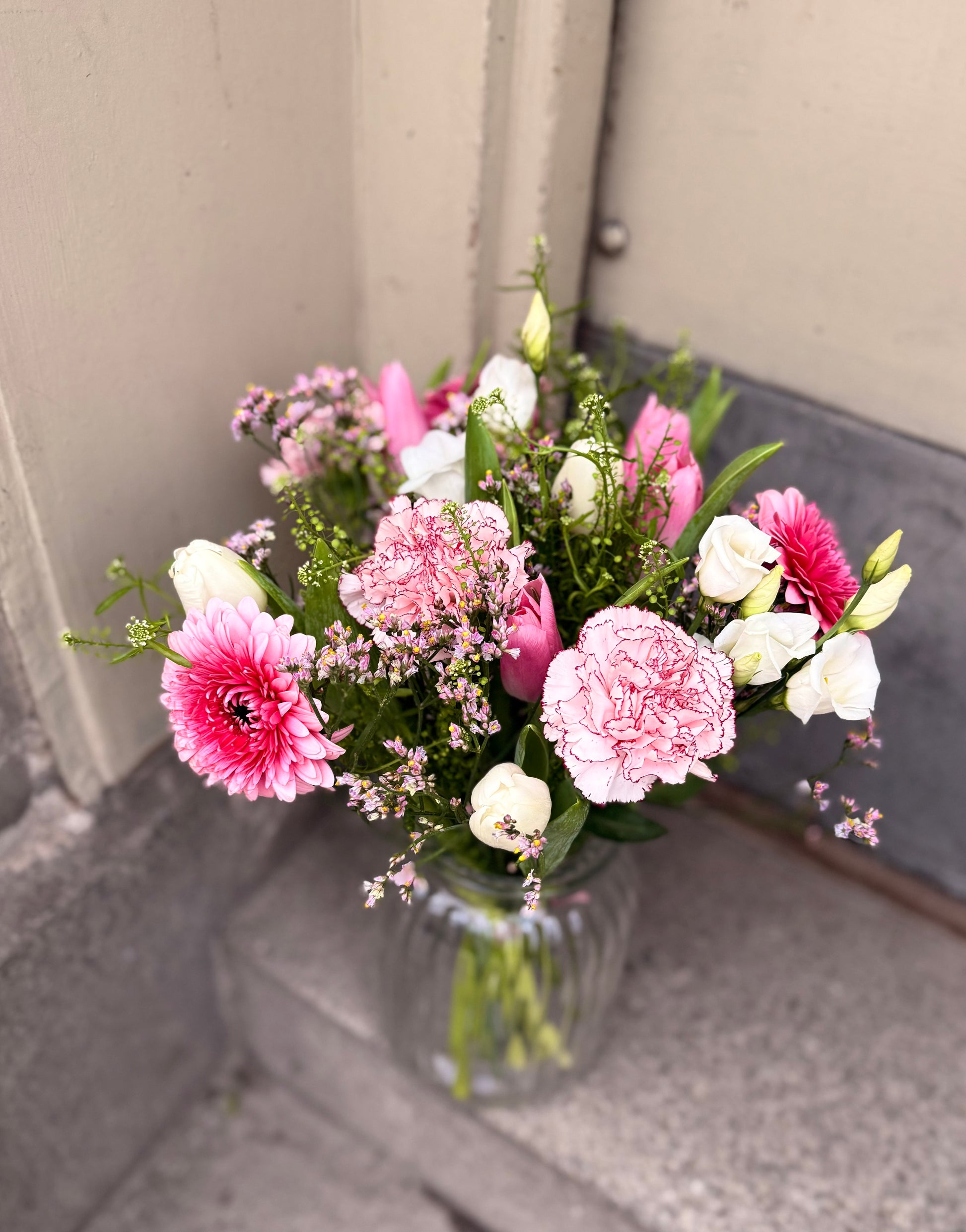 En elegant vårbukett i mjuka rosa toner, balanserad med säsongens gröna inslag. La Vie en Rose skapas av noggrant utvalda blommor för dagen och ger ett tidlöst, romantiskt och exklusivt uttryck. Varje bukett är unik.