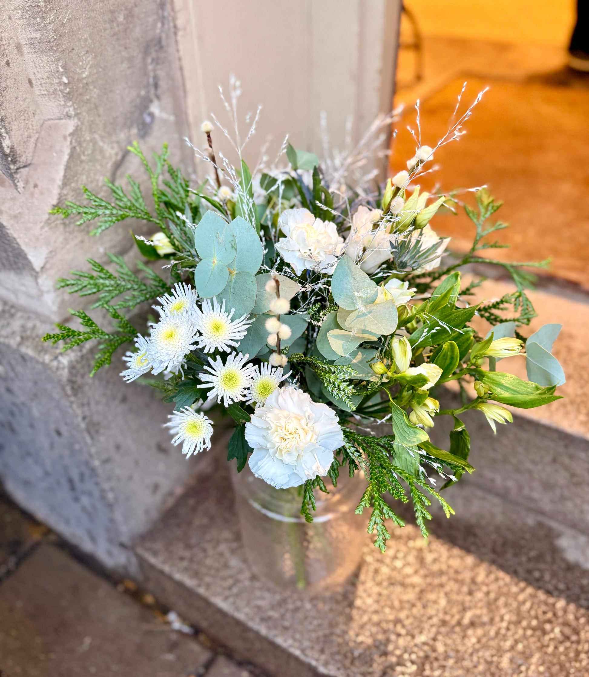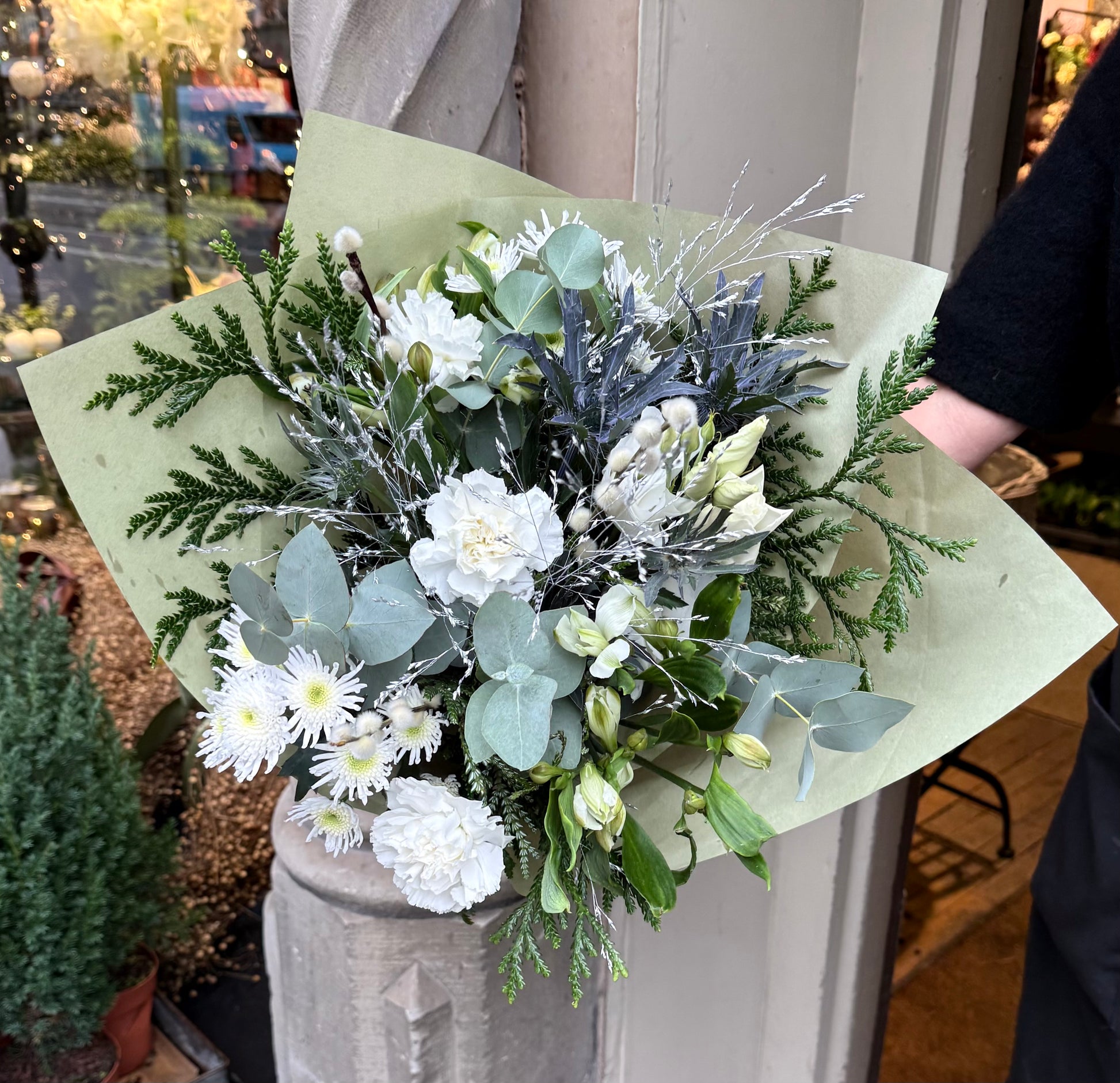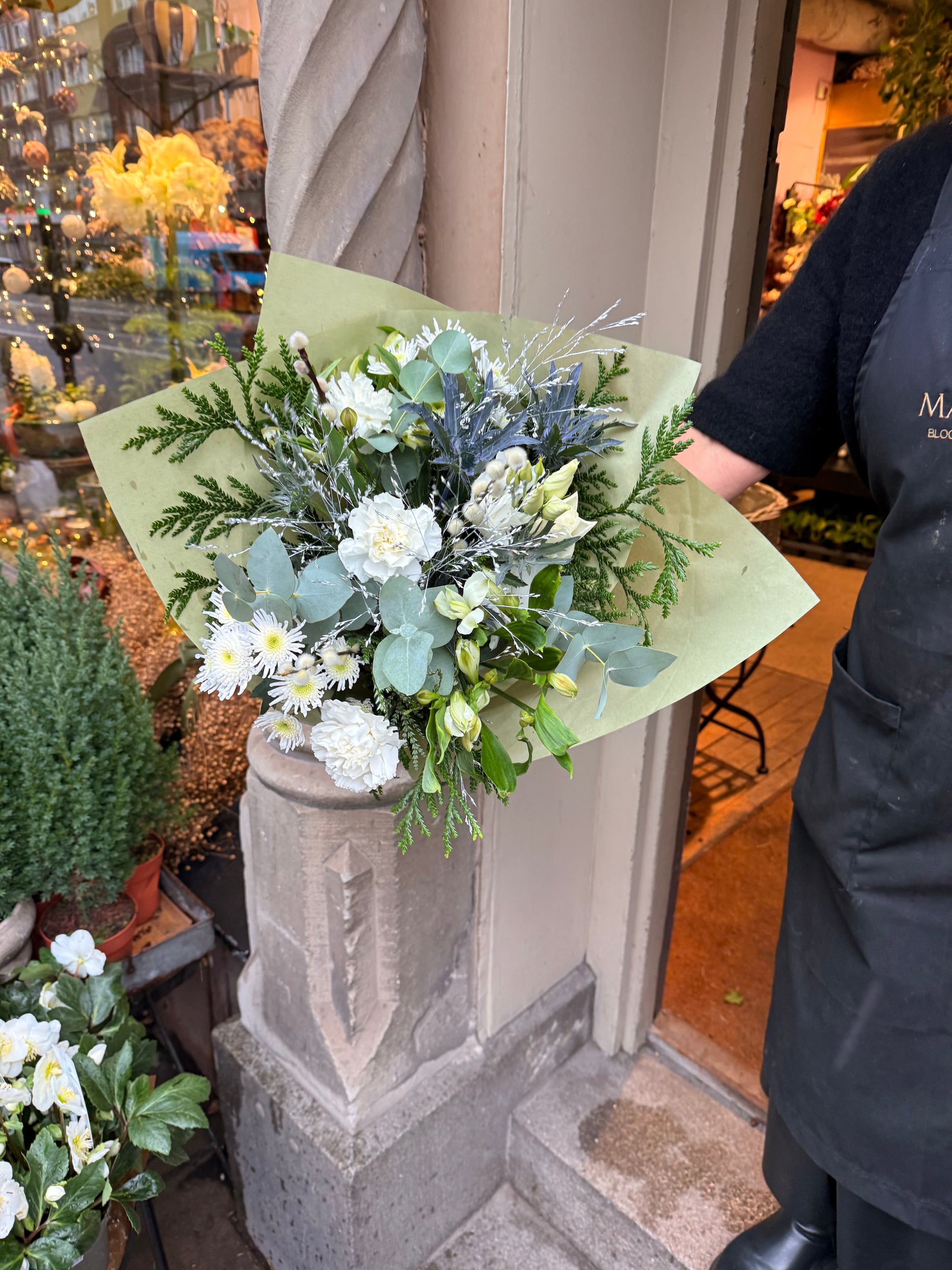 Vi har fyllt buketten med nejlikor, chrysanthemum, eukalyptus och grönt som håller stilen även om granen gett upp. Resultatet? En frostig skönhet som lyser upp hemmet, middagsbordet eller någon du tycker riktigt mycket om.